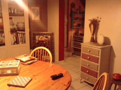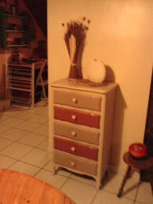 Une commode teintée chêne foncé reprend vie avec des tiroirs peints en taupe, et aubergine, sur un fond couleur lin...avec les boutons en lin pour qu'ils ressortent bien sur les façades de tiroirs plus foncées.