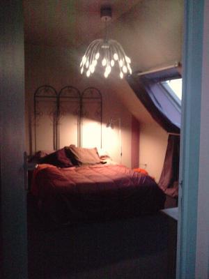 Un paravent en fer forgé comme tête de lit, un luminaire à 30 euros de chez IKEA, deux tringles à rideaux pour le vélux et un rideau occultant aubergine, le tour est joué, mais c'est quand même du travail.